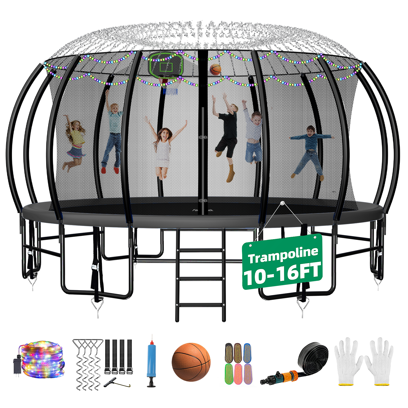 This trampoline can easily hold up a 7-9 people’s family to use, this 16 ft large trampoline can hold up more than 2000lbs. This backyard trampoline is an curved pole trampoline with inner net design. The enclosure net surrounded the whole trampoline, and the spring cover pad is put in the net which eliminates gaps between the mat and net to prevent injurie.”